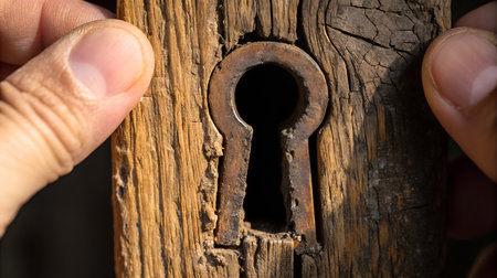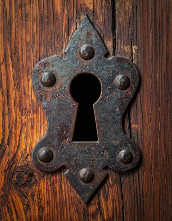 A close-up of an antique brass keyhole set in a rich, grained wood surface. This timeless detail evokes a sense of mystery, secrecy, and the potential for discovery.