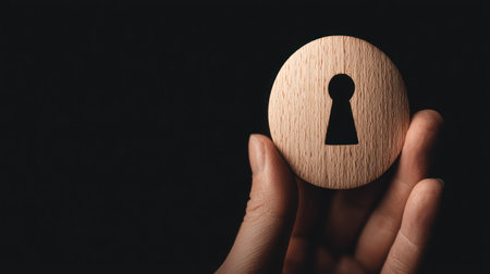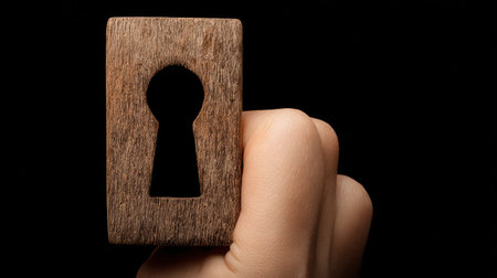 A hand holds a wooden block featuring a keyhole shape, set against a dark backdrop. The composition is sharply focused, highlighting the natural grain of the wood. The lighting is strong, emphasizing the contrasting textures. This image is suitable for various commercial uses, including website design and illustrative content.