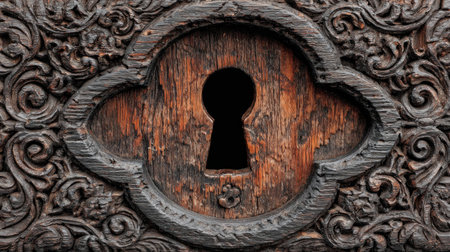 A detailed image showcases a dark keyhole set within an elaborately carved wooden panel. The wood displays varied shades of brown and a rough texture. The close-up composition highlights the detailed patterns. This could be useful for designs related to mystery, security, or decorative arts.