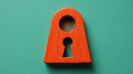 An orange wooden keyhole shape is presented against a turquoise backdrop. The object is isolated, offering a clean, direct visual. The color palette is vibrant and simple, with smooth textures. This image could be suitable for various design projects, web graphics, or educational resources.