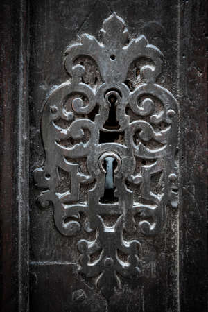 Antique ornate metal keyhole and lock detail on old door in Toulouse, France, closeup.
