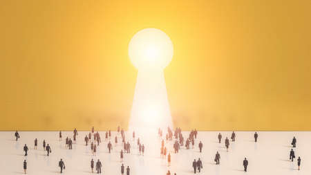 Group of tiny business men and women people walking into a gate shaped like a keyhole