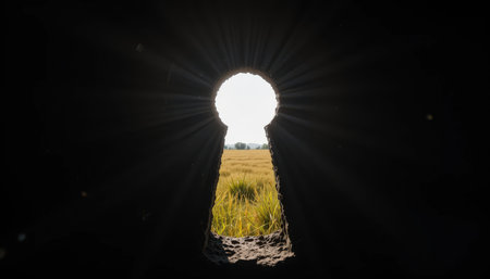Golden fields stretch into the distance, illuminated by bright sunlight filtering through a keyhole-shaped opening.