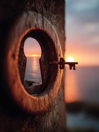 An aged keyhole reveals a scenic sunset over the ocean, with a key resting in the lock. The wooden texture contrasts with the vibrant colors of the sky and water. Soft lighting illuminates the scene, suggesting a calm evening. This image could be utilized for various commercial projects related to vision or access.