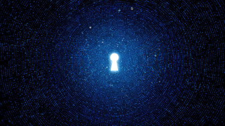 An abstract illustration presents a keyhole shape, centrally positioned within a radiant blue tunnel. The composition features a network-like pattern, suggesting interconnectedness. The digital style and luminous glow evoke a sense of advanced technology. Suitable for projects related to cybersecurity and data privacy, the image offers versatility for various applications.