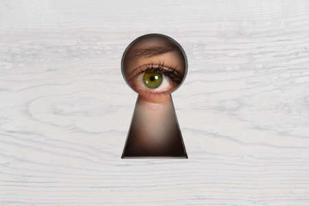 woman peeping through keyhole, concept of gossip, espionage. Close-up Photo Of Persons Seen Through Keyhole