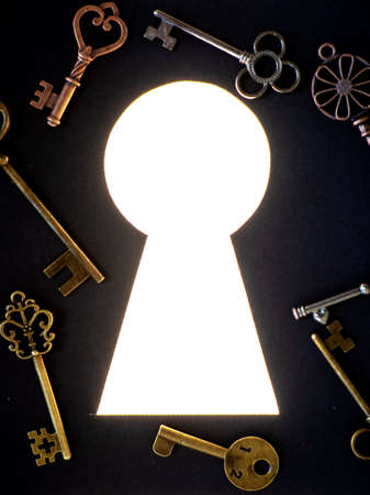 Mysterious keyhole with light shining through on dark background copy space available for text