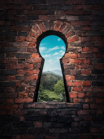 Nature landscape seen through a keyhole window in a dark brick wall.