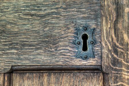 Antique keyhole on an old wooden door. Vintage lock symbol. Exit or solution concept. Problem solving.