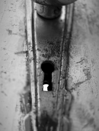 Keyhole in a rusty metal door revealing darkness beyond