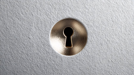 A minimalist illustration of a keyhole on a metallic plate, symbolizing access and security, with a subtle shadow effect on a plain white background.