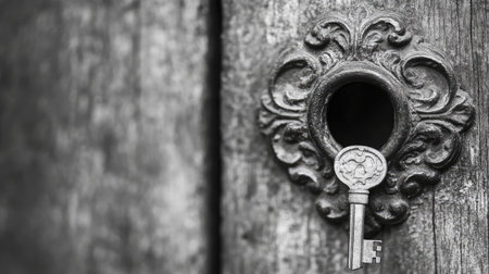 This black and white photograph features a vintage key nestled in an ornate keyhole, set against a weathered wooden door, creating an intriguing atmosphere of mystery and elegance.