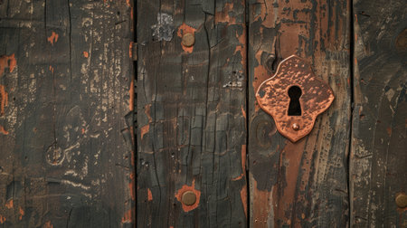 Antique decor - decorative element with copper keyhole on aged wood, vintage design image