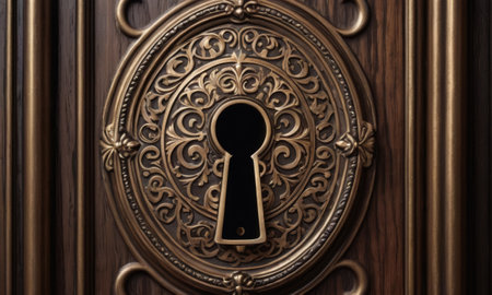 An intricately carved bronze keyhole set in a rich, polished wooden door, its ornamental design evokes a sense of vintage elegance. The craftsmanship highlights the beauty of classical woodwork and metal art. AI generation