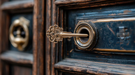A close-up of an antique key inserted into an ornate lock on a wooden door, showcasing intricate craftsmanship and vintage design. Ideal for historical themes.