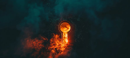 A mysterious keyhole glows with a warm, fiery light in a dark stone wall, revealing the silhouette of a key within.