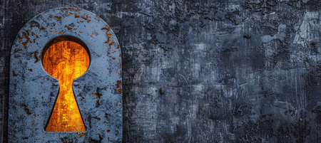 Mysterious keyhole illuminated by light on dark background with copy space for text placement
