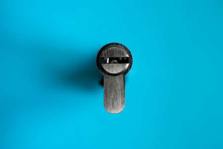 A door lock cylinder core on the blue background. The cylinder of the lock. Installing a new lock on the door. Spare parts for the door.