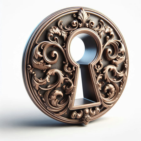 Intricate keyhole design with detailed metalwork, softly illuminated, evokes a sense of mystery and wonder about the hidden space beyond the door, AI generated