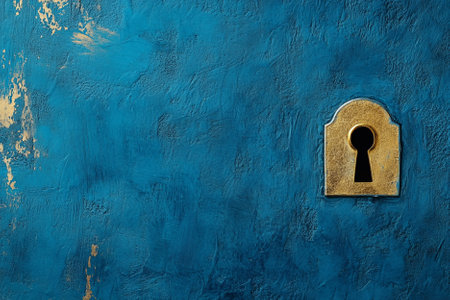 Old keyhole on a blue wall. Copy space for text.
