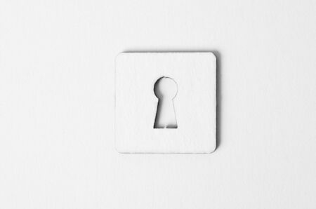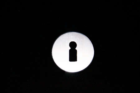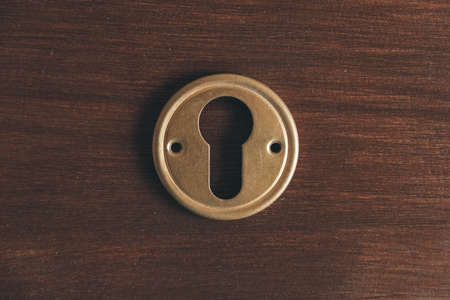 Metal keyhole on a brown background. Top view. Copy, empty space for text.