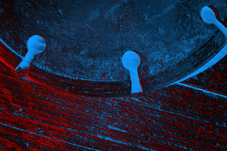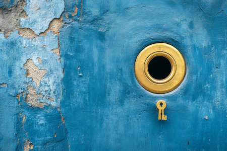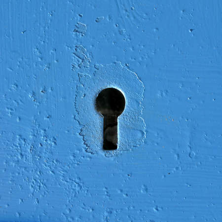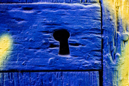 Keyhole in blue and yellow old vintage painted front door close up. Hole lock in retro doorway, gate where key is inserted to open it. architectural details. Abandoned homestead.