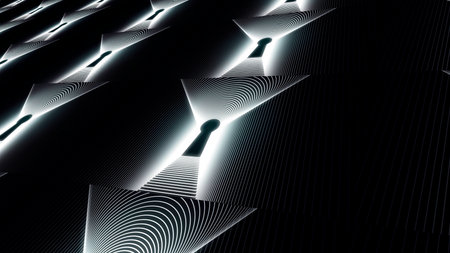 A key holes with bright light coming in from outside. Animation. Rows of animated digital key holes.