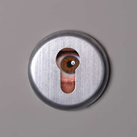 A woman peeps through the keyhole, curiosity. Distrust of others, spies on other people