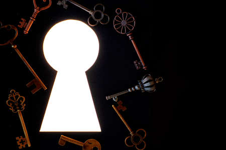 Many different antique keys and a keyhole. Finding the right key to the lock, concept. Retro vintage brass keys on a black background