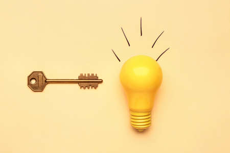 Light bulb with key on color background