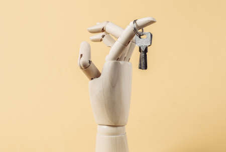 Keys hanging on a stick of a wooden hand on a yellow background