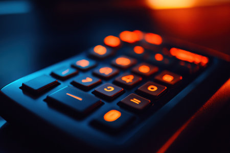 A striking close-up image of a modern calculator featuring vibrant backlit buttons in orange and blue. Perfect for business and technology themes.