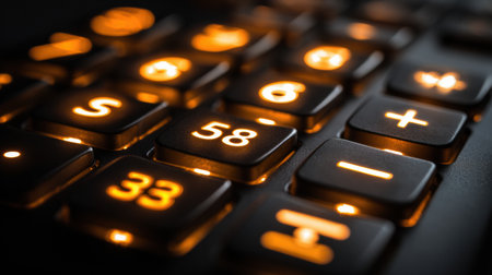 Close-up view of calculator keys displaying illuminated numbers and symbols, capturing a focused study environment in low light at night.