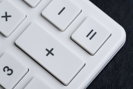 Closed up of white calculator buttons such as plus, minus, multiply and equal on black leather using as maths, investment banking and accounting.