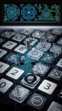 A macro shot of a calculator keypad illuminated with pink and purple lighting, creating a modern, technology-inspired visual effect.