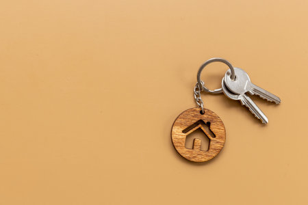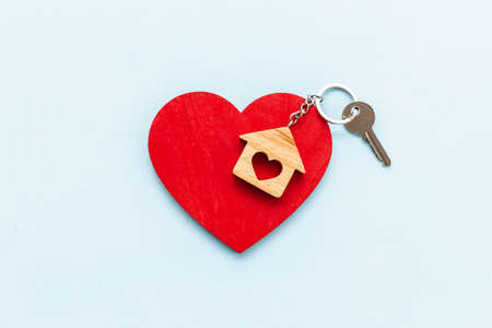 Real estate or property concept. Selective focus of key and house keychain on wooden background with copy space.