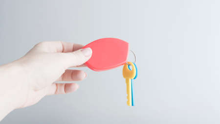 The hand holds the keys with the house keychain. Purchase of apartments.