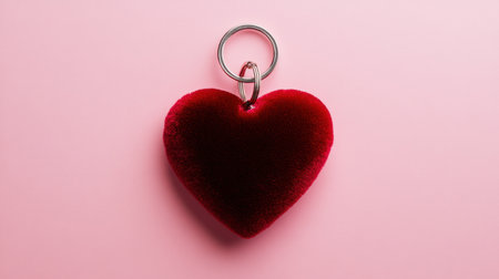 A delightful plush red heart keychain hangs against a soft pink background, symbolizing love and affection, perfect for gifts and romantic celebrations.