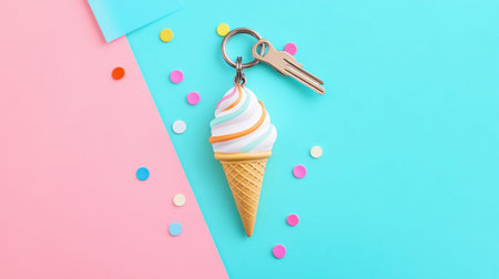 This vibrant ice cream keychain brings a playful touch to any setting. Surrounded by colorful confetti, it embodies joy and fun, perfect for summer vibes.