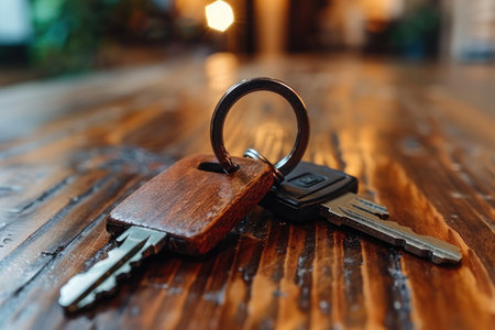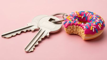 A visually stunning close-up photo of keys and a wedding ring resting on a pink background, creating a romantic and modern feel with soft shadows.