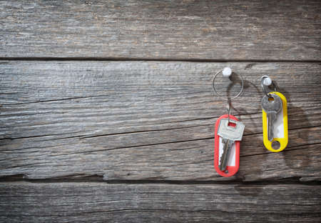 Hanging keys on the green wall, Various three keys hanging on green background.
