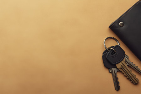 A collection of everyday essentials lays on a soft, neutral-toned background, showing a wallet alongside a set of keys, emphasizing simplicity and functionality in daily life.