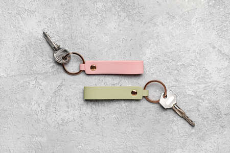 Three old keys on a ring on an abstract gray background. View from above. Space for lettering and design