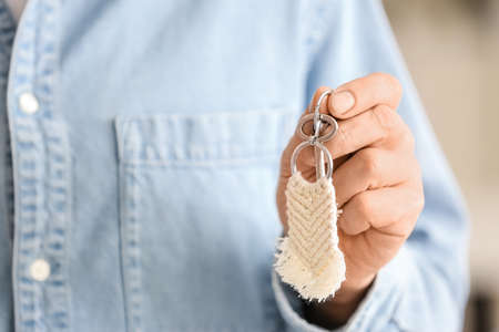 Mortgage concept. Men hand holding key with house shaped keychain. Modern light lobby interior. Real estate, moving home or renting property.