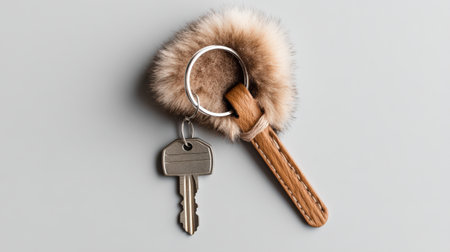 A cozy winter cabin key with a fluffy keychain, isolated on a clean white background, ready for vacation