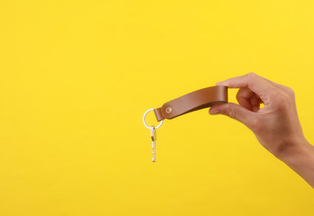 Male hand holding RFID keychain tag on yellow background. Concept of modern security lock. Smart technologies. Cropped image. Close up. Copy space