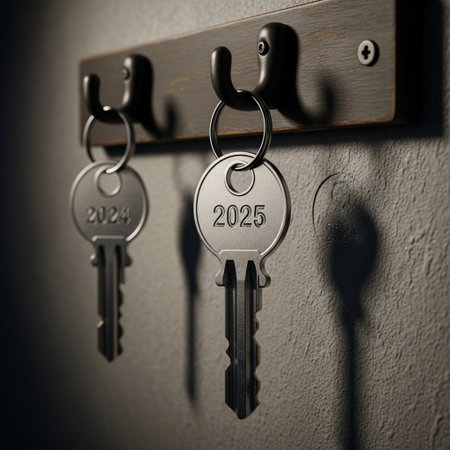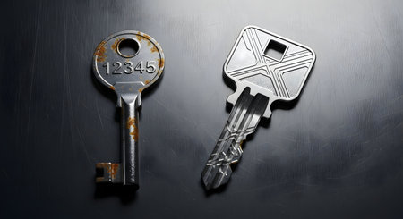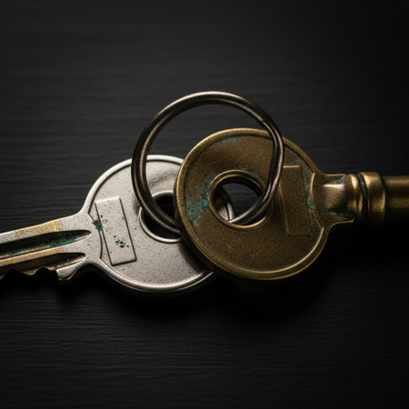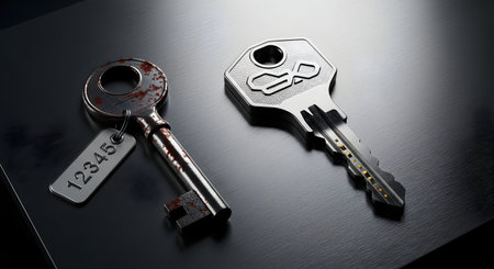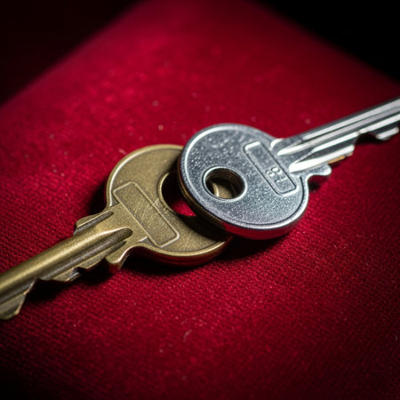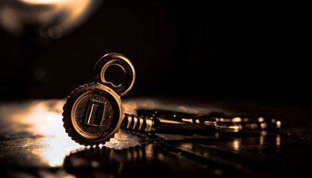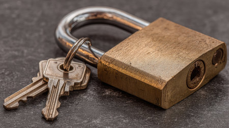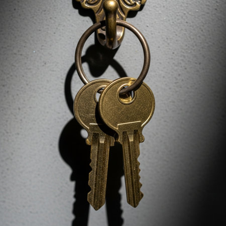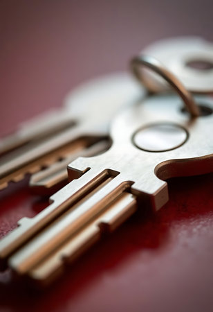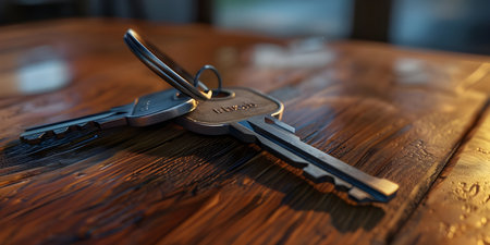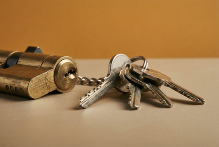 Close-up of metal keys attached to a lock cylinder on a smooth surface with warm background. Concept for security, access, protection, and home safety solutions in everyday life.