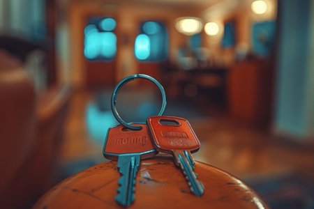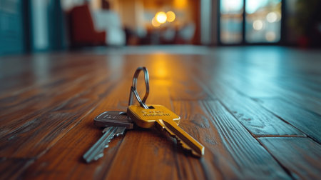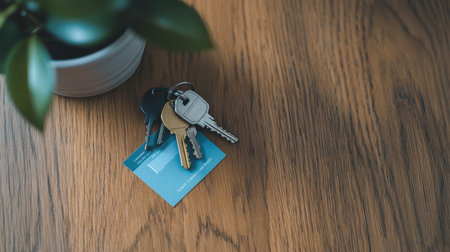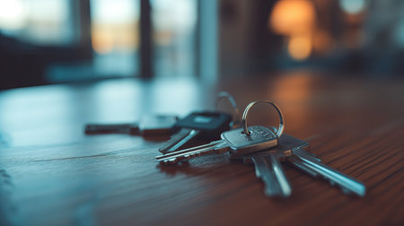 Keys on the table in new apartment or hotel room. rent, investment, real estate property concept. Generative Ai