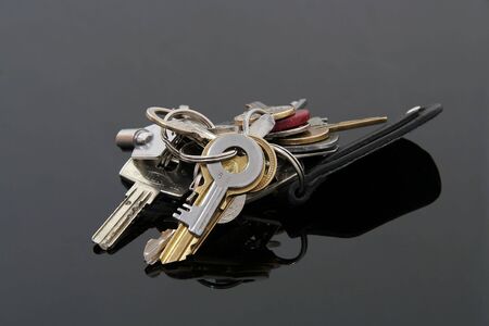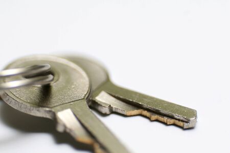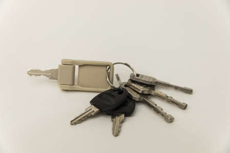 A big bunch of keys, laid out in a circle, from the different locks, lies on a plane white background, copy space.