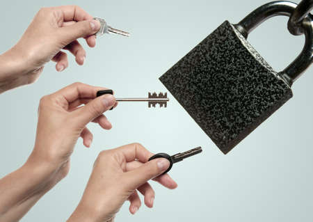 Three woman hands with different keys try to open the lock. Concept of theft, deception and hacking